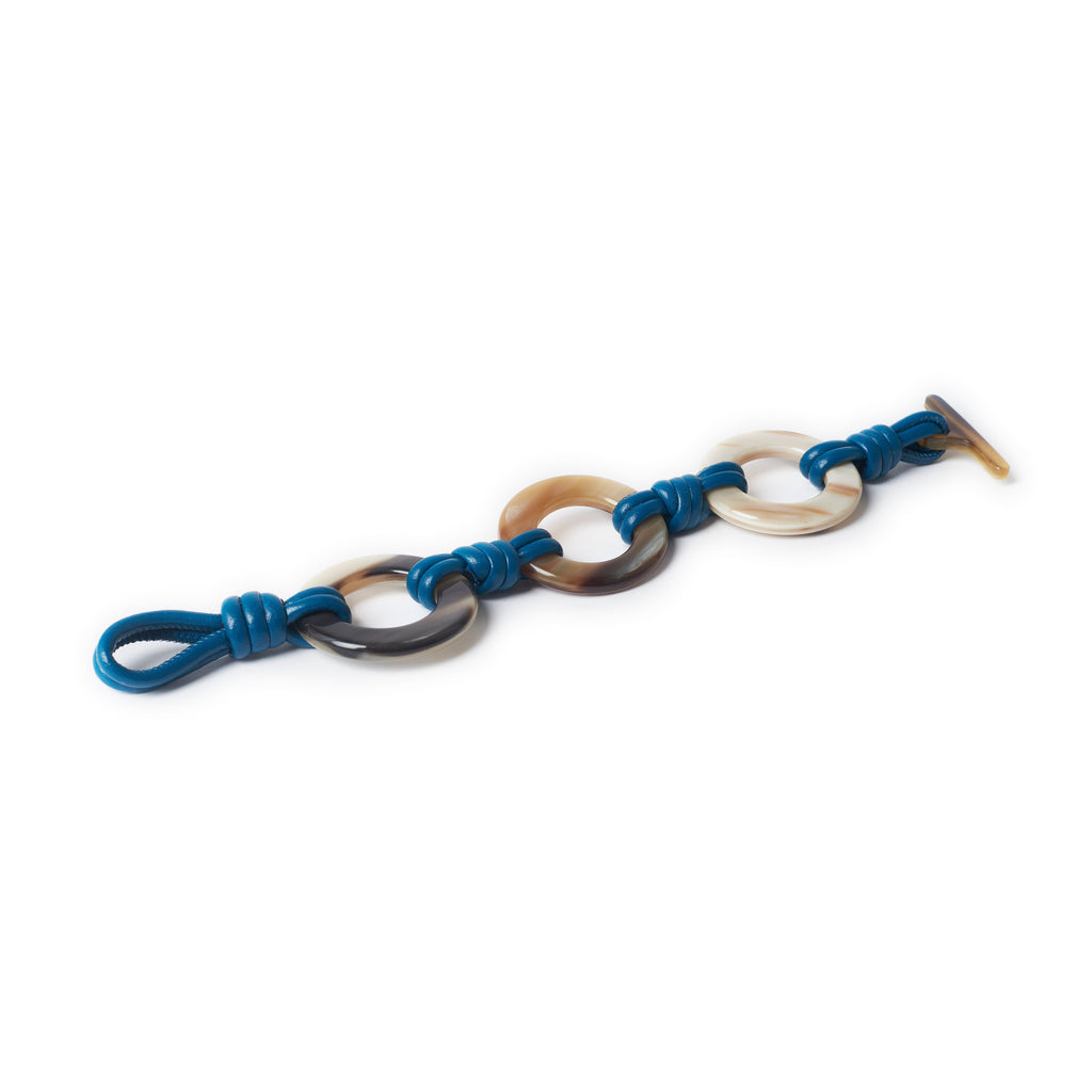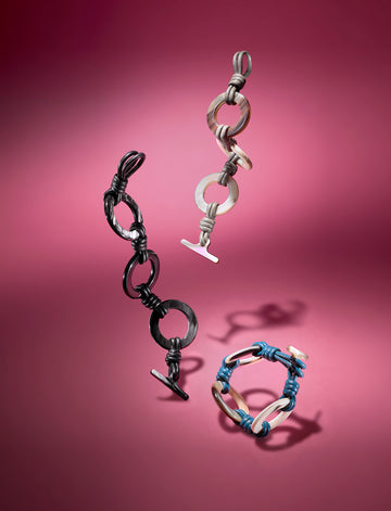 Nuestra nueva pulsera Elle es una pieza clásica que podrás lucir y disfrutar a diario. Está hecha de piel de cordero tejida y anillos de cuerno auténtico que sin duda añadirán un toque de distinción a tu look.