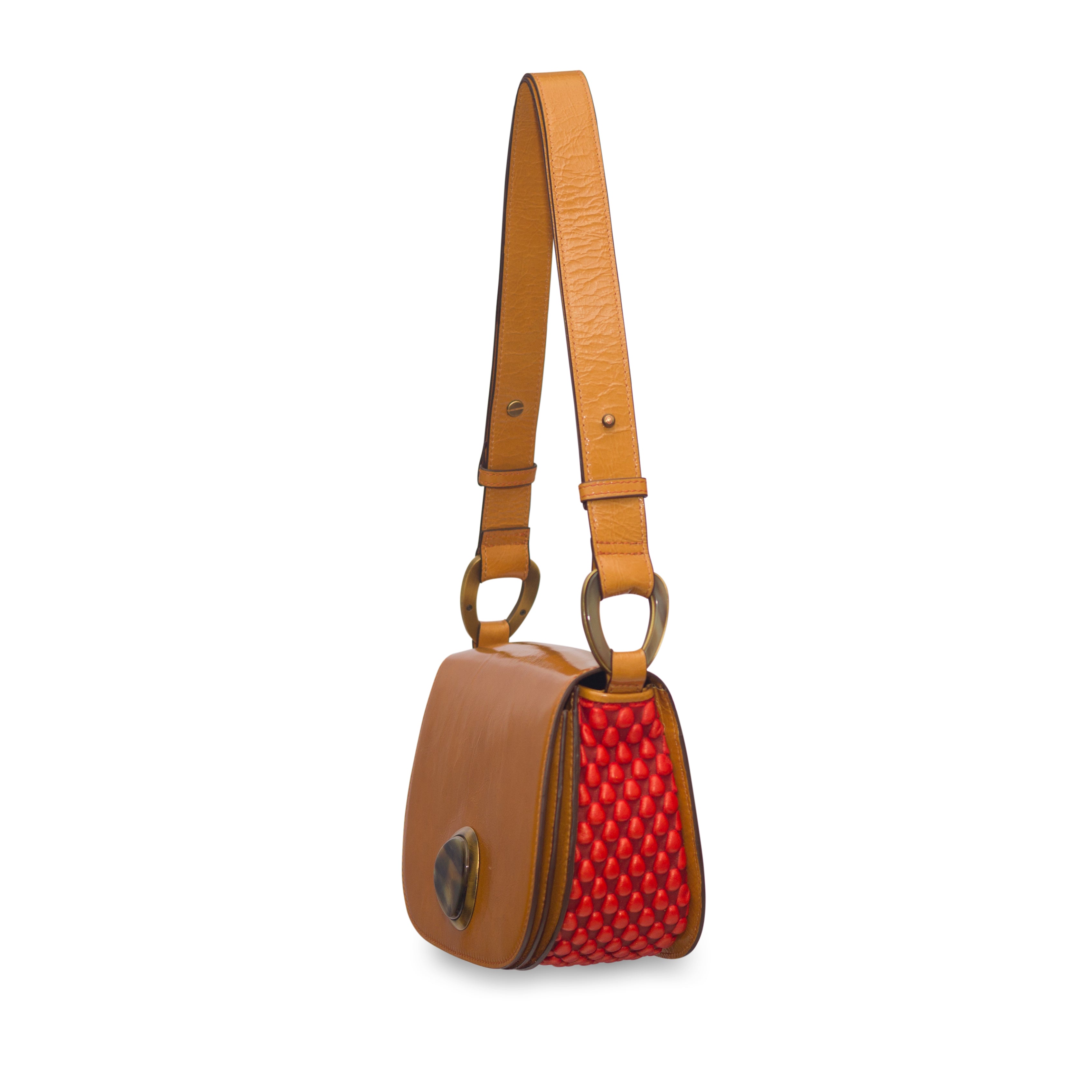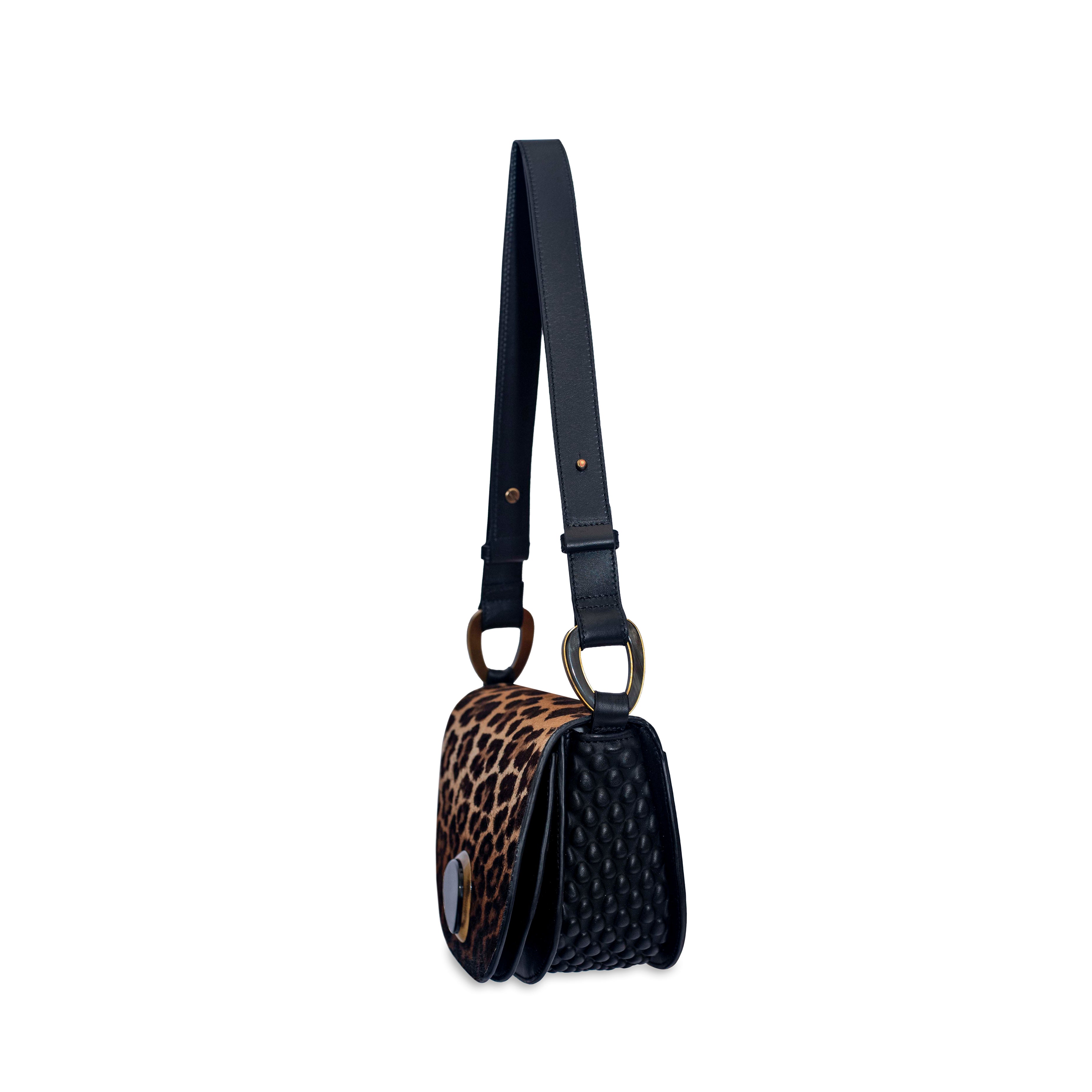 New Victoria is a spectacular structured shoulder bag featuring a soft rounded shape and genuine horn adornment. It has an adjustable strap with horn links and is handcrafted by skilled European artisans using the finest calfhair/patent leather which is beautifully combined with our signature velvety soft nappa bubbles.